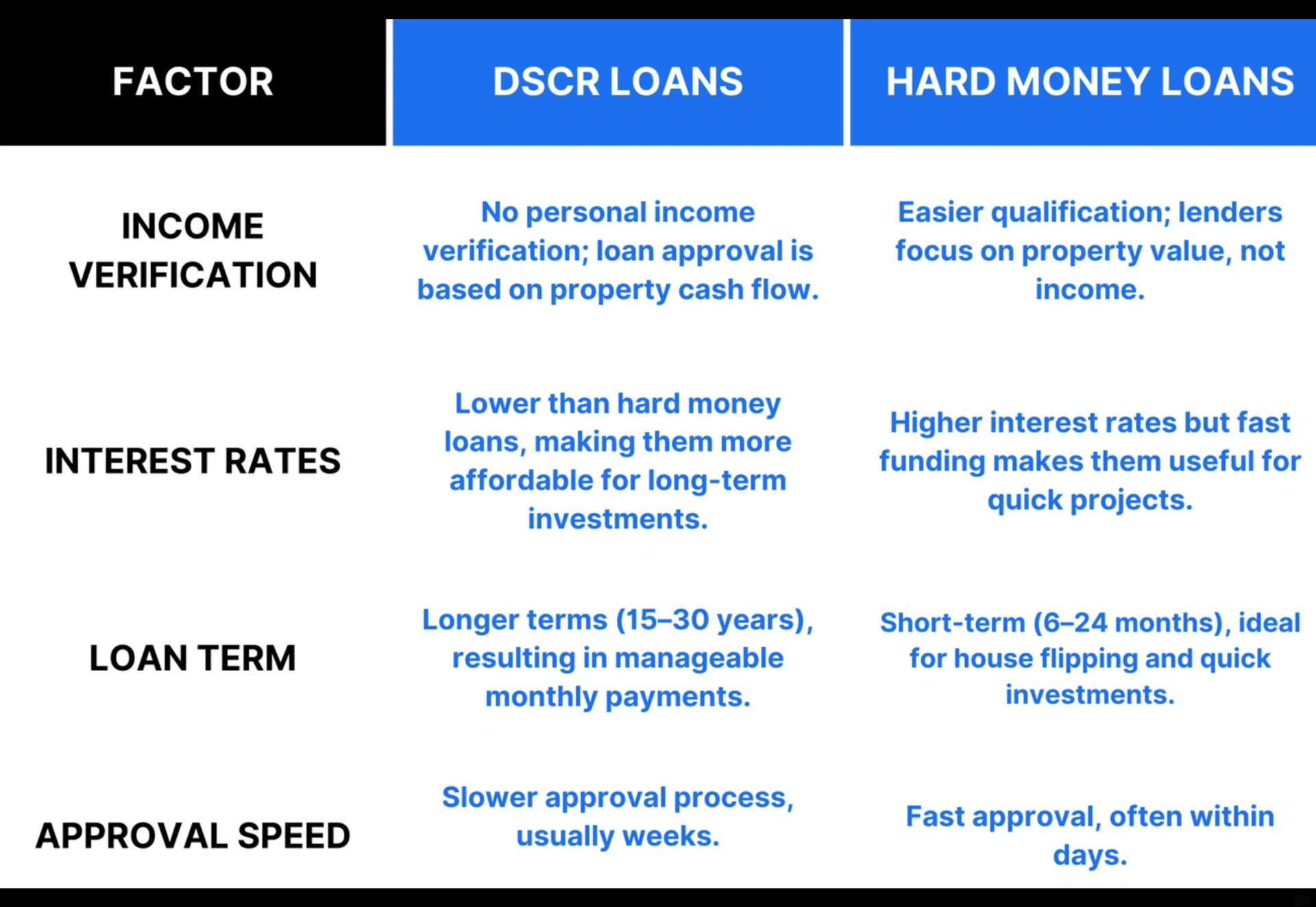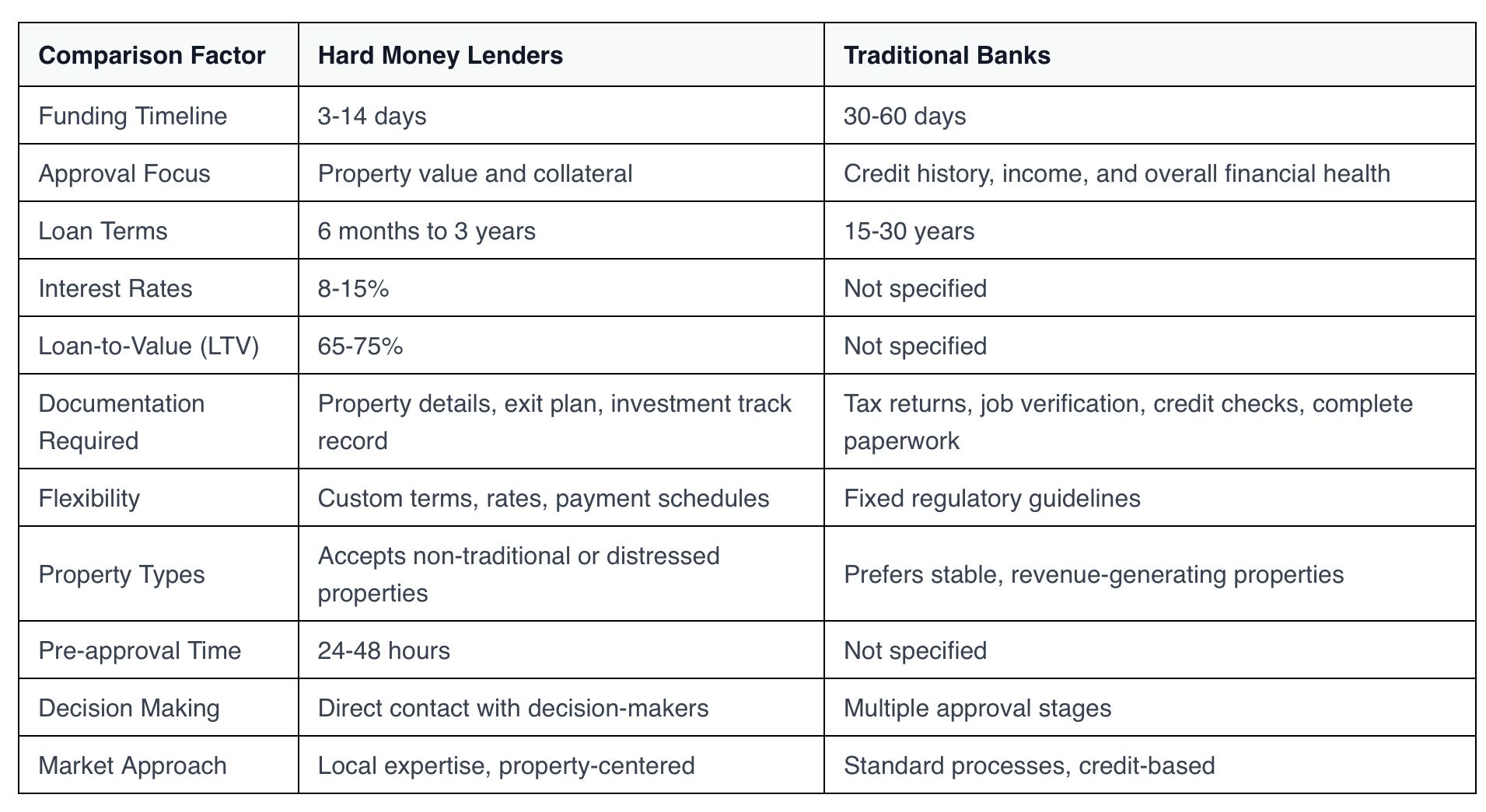 Timeline: Traditional bank loans need 30-60 days to close. Hard money loans can fund within 5-14 days.